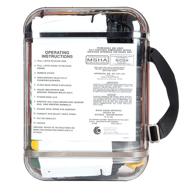 The EBA 6.5 is a self-contained, closed circuit breathing apparatus using compressed oxygen as a source rather than generating oxygen from chemicals. The rugged clear case allows the miner to quickly and accurately visually assess the condition of the device. The oxygen delivery system allows the user to inhale immediately from the device when donned, and provides up to 100 liters of oxygen flow during high work rates. Manual adjustment of the oxygen valve will provide a user at rest up to 8 hours of respiratory protection.